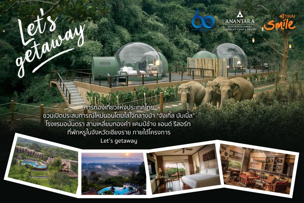 ททท. ชวนเปิดประสบการณ์ใหม่“จังเกิ้ล บับเบิ้ล”นอนโดมใสใจกลางป่า โรงแรมอนันตรา สามเหลี่ยมทองคำ แคมป์ช้าง แอนด์ รีสอร์ท ที่พักหรูในจ.เชียงราย ภายใต้แคมเปญ Let’s getaway