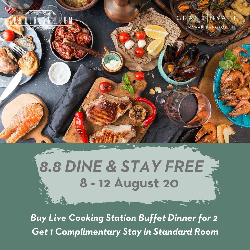 โรงแรมแกรนด์ ไฮแอท เอราวัณ กรุงเทพฯ ขอเสนอโปรโมชั่นสุดพิเศษ Dine & Stay Free ระหว่างวันที่ 8-12 สิงหาคม 2563 อิ่มอร่อยกับบุฟเฟ่ต์นานาชาติที่ห้องอาหาร เดอะ ไดนิ่งรูม และรับฟรีห้องพัก Standard room 1 คืน! เพลิดเพลินกับการรับประทานอาหารแบบ Live Cooking Station Buffet มื้อเย็น สำหรับ 2 ท่าน ในราคาเพียง 4,780 บาท