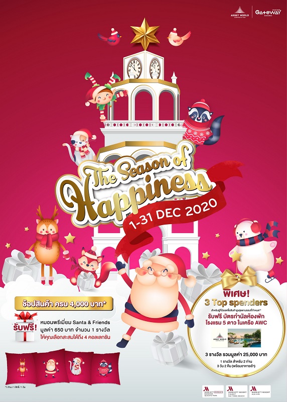 ศูนย์การค้าเกทเวย์ เอกมัย มอบช่วงเวลาแห่งความสุขส่งท้ายปีตลอดเดือนธันวาคมนี้ กับแคมเปญ The Season Of Happiness 2020 มอบประสบการณ์ช้อปสนุก รับของขวัญสุดพิเศษมากมาย ตั้งแต่ 1 – 31 ธันวาคม นี้ เพียง *ช้อปสินค้าครบ 4,000 บาทขึ้นไป รับฟรีทันที! หมอน Santa & Friends สุดน่ารัก มูลค่า 650 บาท มีให้เลือกสะสมถึง 4 คอลเลกชัน พิเศษ! สำหรับผู้ที่มียอดซื้อสินค้าสูงสุด TOP SPENDER 3 ท่าน (ตามรอบที่กำหนด) รับบัตรกำนัลห้องพักโรงแรม 5 ดาว Marriott Hotel ในเครือ AWC ไปนอนชิลรับลมหนาวส่งท้ายปี จำนวน 3 รางวัล มูลค่ารวมกว่า 25,000 บาท พร้อมร่วมสัมผัสแห่งความประทับใจกับบรรยากาศการประดับไฟตกแต่ง เนรมิตพื้นที่แห่งความสุขทั้งภายใน และภายนอกศูนย์การค้าแบบจัดเต็ม เพื่อร่วมเฉลิมฉลองเทศกาลคริสต์มาส ให้ได้ถ่ายภาพเก๋ๆ ไปกับตัวการ์ตูนเหล่าผองเพื่อนสุดแสนน่ารัก ของคุณลุงซานต้าแสนใจดี