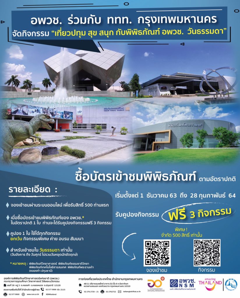 องค์การพิพิธภัณฑ์วิทยาศาสตร์แห่งชาติ (อพวช.) จับมือ การท่องเที่ยวแห่งประเทศไทย (ททท.) สำนักงานกรุงเทพมหานคร ส่งความพิเศษให้ประชาชนจัดกิจกรรม “เที่ยวปทุม สุข สนุก กับพิพิธภัณฑ์ อพวช. วันธรรมดา” มอบสิทธิ์พิเศษ เพียงซื้อบัตรเข้าชมพิพิธภัณฑ์ในวันธรรมดาของ อพวช. ต.คลองห้า จ.ปทุมธานี รับคูปองร่วมกิจกรรมฟรี 3 กิจกรรม เพื่อส่งเสริมและกระตุ้นการท่องเที่ยวเชิงการเรียนรู้พิพิธภัณฑ์แก่นักท่องเที่ยวในวันธรรมดาเริ่มตั้งแต่เดือน 1 ธันวาคม 2563 – 28 กุมภาพันธ์ 2564