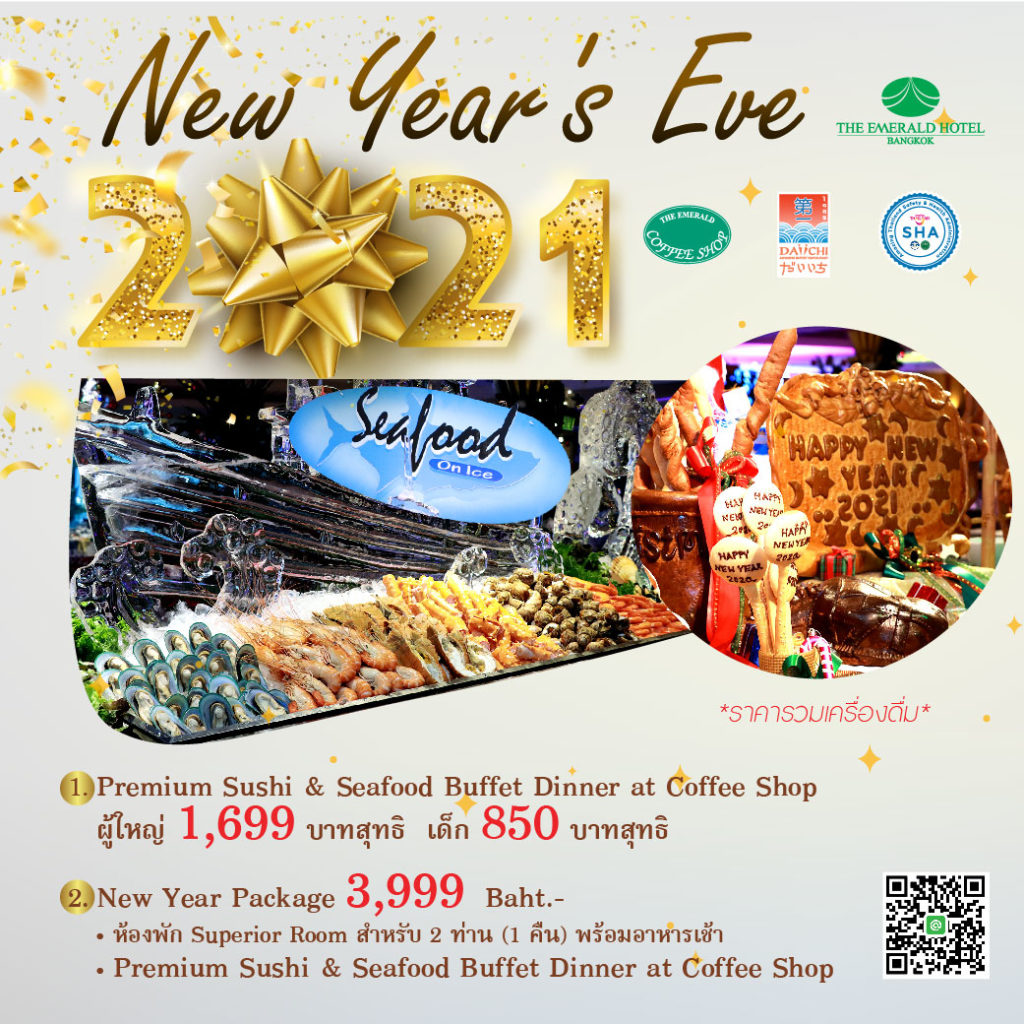 ขอเชิญชวนท่านมาร่วมส่งท้ายปีเก่า ต้อนรับปีใหม่ ในค่ำคืนวันที่ 31 ธันวาคม 2563 ที่ดิเอมเมอรัลด์ ค็อฟฟี่ช็อพ โรงแรม ดิ เอมเมอรัลด์  อิ่มอร่อยกับบุฟเฟต์นานาชาติรวมพรีเมียมซูชิและซีฟู้ด ที่ได้คัดสรรเมนูมาเป็นพิเศษเพื่อมื้อค่ำสุดหรูของคุณ พร้อมไวน์แบบ “ดื่มไม่อั้น” เพลิดเพลินกับดนตรีบรรเลงสด เสริมบรรยากาศสนุกสุขสันต์ให้ทุกท่านได้ประทับใจ  แล้วลุ้นรับรางวัลจากหางบัตร ผู้ใหญ่ท่านละ 1,699 บาทถ้วน เด็ก 850 บาทถ้วน ช่วงนับเวลาถอยหลังเข้าสู่ปีใหม่ รับสปาร์คกลิ้งไวน์ท่านละ 1 แก้ว