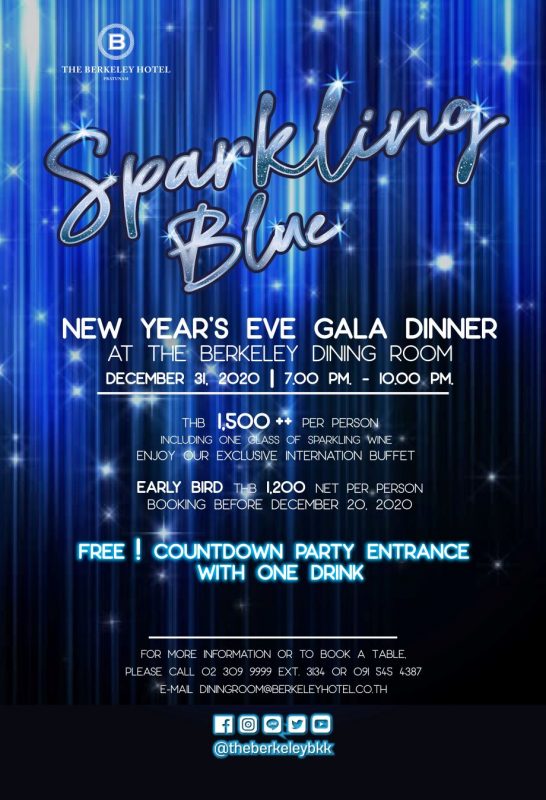 โรงแรมเดอะ เบอร์เคลีย์ ประตูน้ำ ขอเชิญท่านและครอบครัวมาร่วมฉลองค่ำคืนสุดท้ายของปีด้วยบุฟเฟต์นานาชาติระดับพรีเมียม ในบรรยากาศ “Sparkling Blue” ณ ห้องอาหารเดอะ เบอร์เคลีย์ ไดนิ่งรูม คืนวันพฤหัสบดีที่ 31 ธันวาคม 2563 เวลา 19.00 น. – 22.00 น. พบกับความอลังการของบุฟเฟต์นานาชาติ หลากหลายเมนู อาทิ กุ้งแม่น้ำเผา บาร์บีคิวปิ้งย่าง และอาหารทะเลสดๆ ปูยักษ์อลาสก้า กั้ง กุ้งแดง หอยแมลงภู่นิวซีแลนด์ หอยนางรม ฟัวกราส์ ทุกเมนูเสิร์ฟไม่อั้น