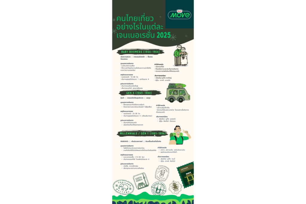 AirAsia MOVE แพลตฟอร์มจองการเดินทางชั้นนำของเอเชีย ซึ่งได้รับรางวัล Asia’s Best Travel Booking App จากเวที World Travel Tech Awards เป็นปีที่ 3 ติดต่อกัน เปิดเผยรายงานเชิงข้อมูล (Data-Driven Report) วิเคราะห์พฤติกรรมการเดินทางของนักท่องเที่ยวไทย 3 เจเนอเรชันหลัก ได้แก่ Baby Boomers, Gen X และ Millennials ในปี 2025 รายงานฉบับนี้อ้างอิงจากฐานข้อมูลการจองหลายล้านรายการ ครอบคลุม เที่ยวบิน โรงแรม และบริการเสริม เพื่อถอดรหัสพฤติกรรมการวางแผน การจอง และการใช้จ่ายของนักเดินทางในแต่ละช่วงวัย
