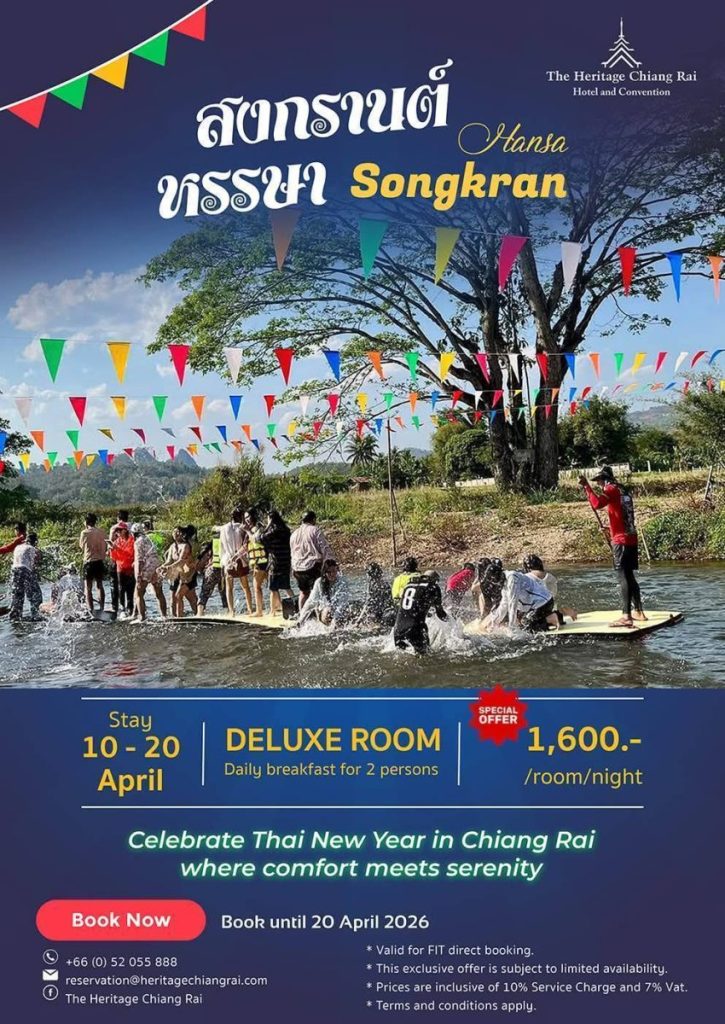 คุณนพพร คงวุฒิ ผู้จัดการทั่วไป โรงแรมเฮอริเทจ เชียงราย โฮเทล แอนด์ คอนเวนชั่น กล่าวว่า”เทศกาลสงกรานต์เป็นช่วงเวลาสำคัญของการท่องเที่ยวภาคเหนือ โดยเฉพาะพื้นที่ที่มีเอกลักษณ์ด้านวัฒนธรรมล้านนาและบรรยากาศที่น่าประทับใจ โรงแรมฯ จึงจัดข้อเสนอพิเศษเพื่อให้ผู้เข้าพักได้สัมผัสประสบการณ์สงกรานต์อย่างเต็มที่ ทั้งความสนุกและการพักผ่อนในทำเลที่เดินทางสะดวก”